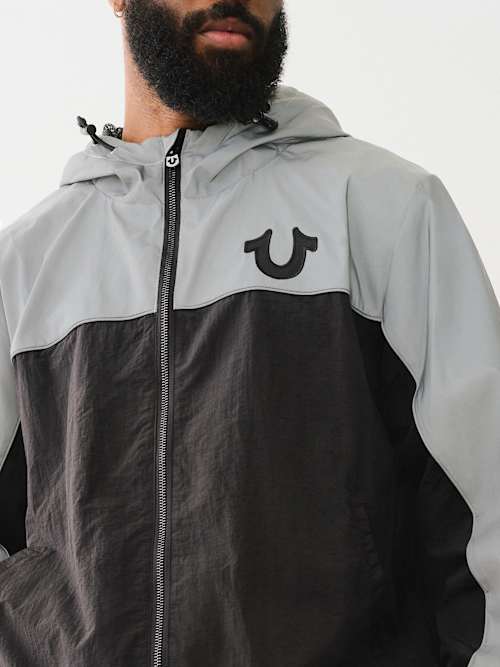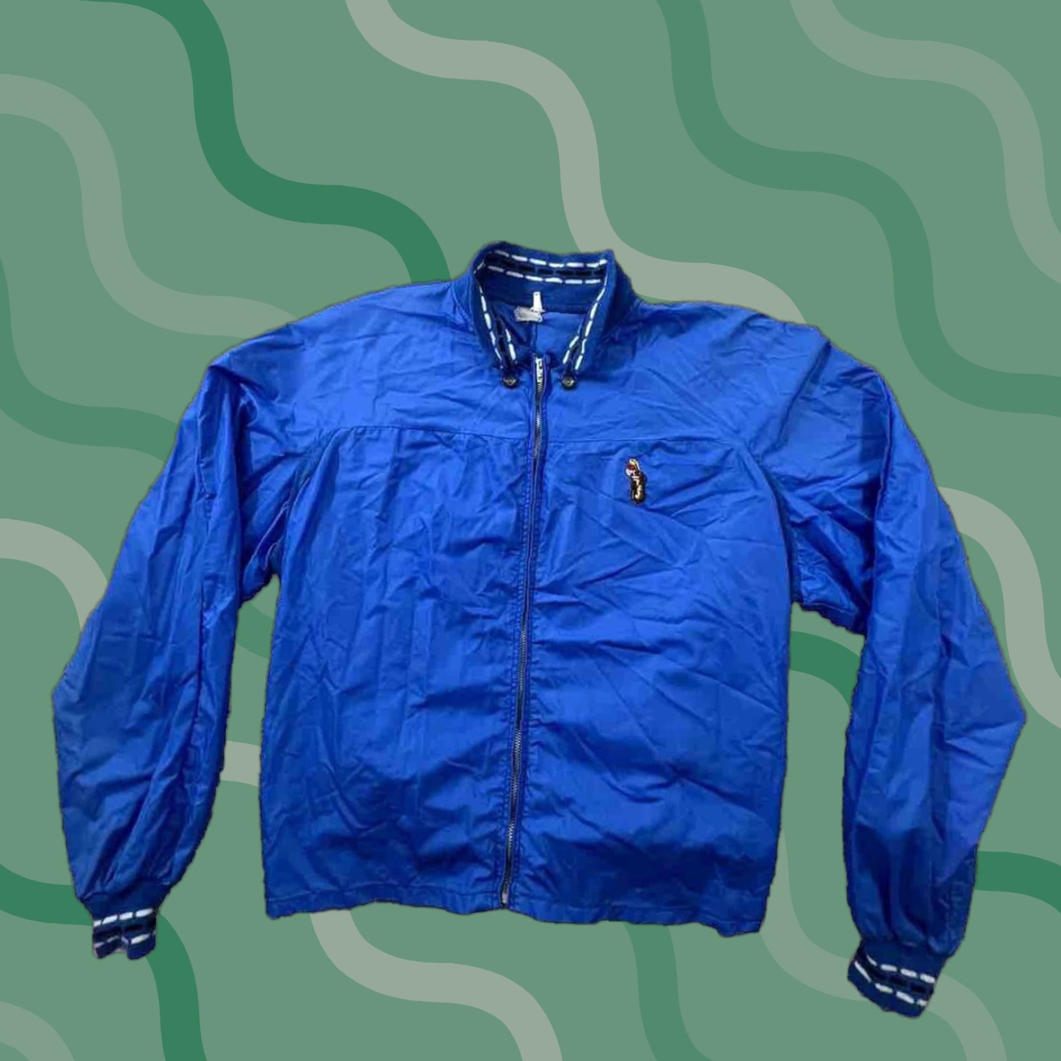 The staple piece to your wardrobe. Classic Varsity Windbreaker Snap Button Closure Standard Pockets with Single Snap Button Striped Elastic Waist, Collar and Cuff Inside Chest Pocket Model is 5’11 wearing a Large