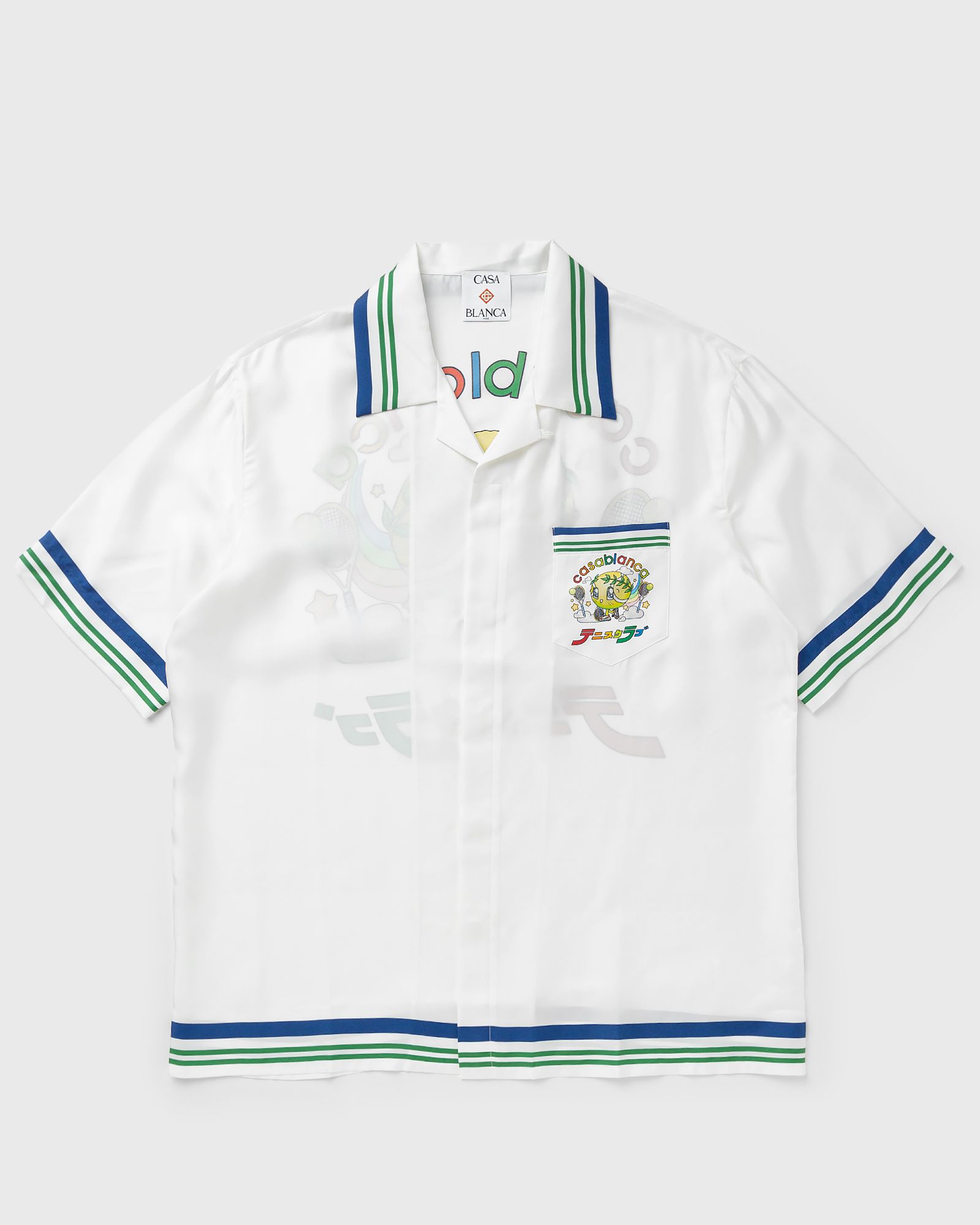 The Casablanca Tennis Mascot Silk Twill Short-Sleeve Shirt is a luxurious short-sleeved shirt made of silk twill with a playful print of the kawaii tennis ball, which plays a central role in the universe of the collection. The design combines elements such as the laurel leaf, the Atlantis sneaker, the racket, and the kawaii eyes, which together create a unique, characterful artwork. – Cuban collar – Button closure – Interlocking CC logo corozo buttons – Chest pocket