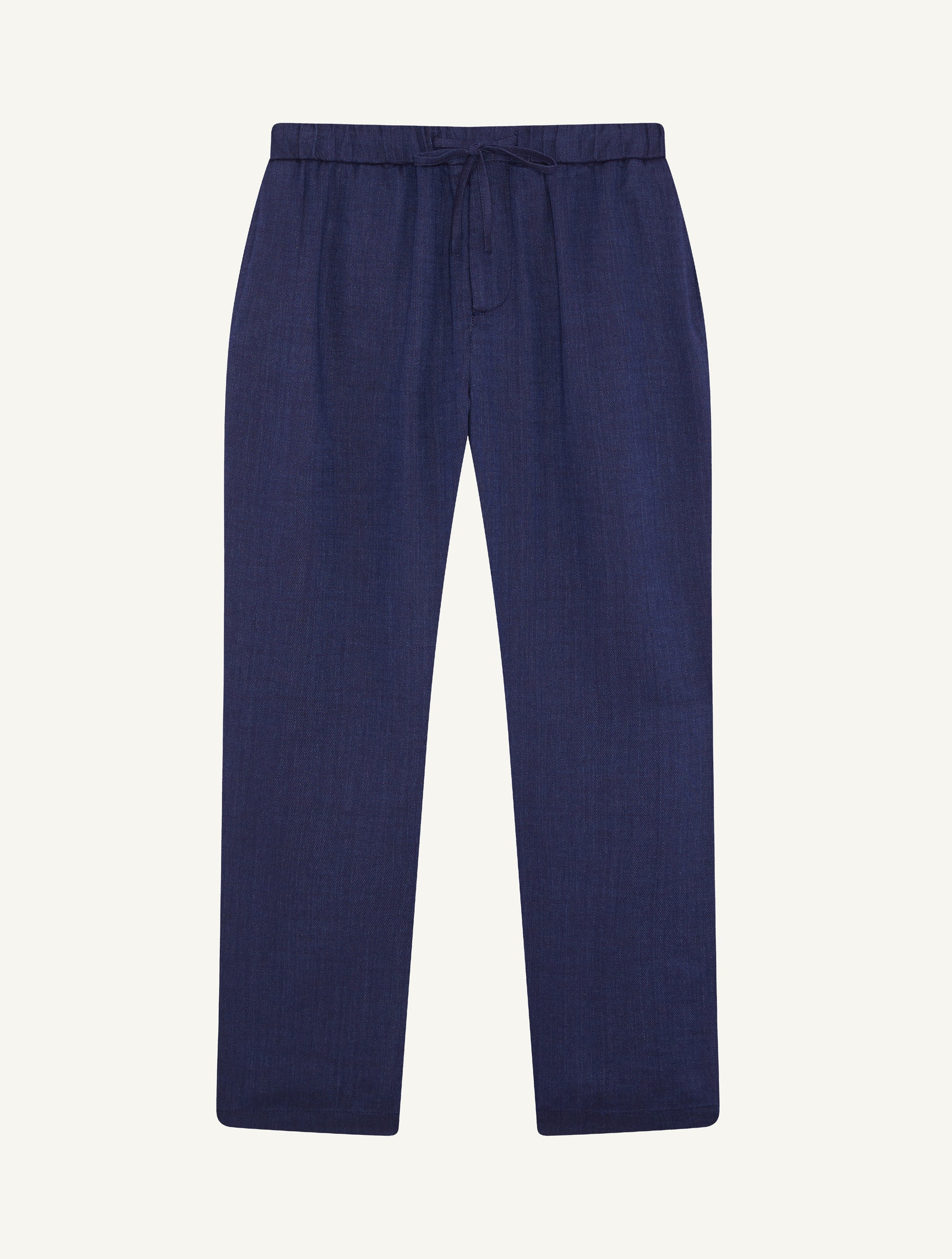 FRESCOBOL CARIOCA Oscar Linen Chinos Navy Cut from a unique cotton-linen blend with a slim fit silhouette and drawstring waist, our Oscar Trousers are easy yet elevated, an everyday essential. Zipper Closure with drawstring waist detailing. Composition: 54% Linen 46% Color: Navy Fit: Slim Tapered Leg