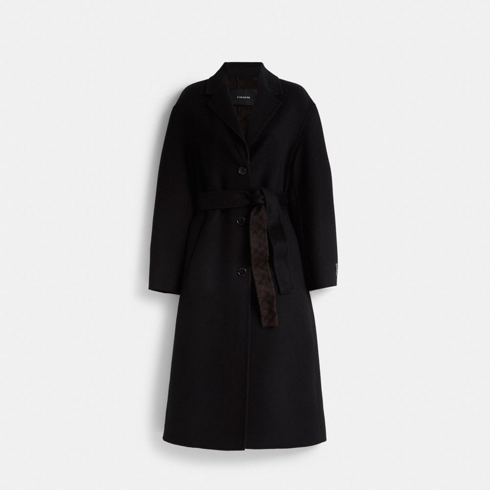 A little (re)love goes a long way. Sourced from the shelves of our Coach Repair Workshop this coat was lovingly restored to its original condition by our talented craftspeople. Keeping waste out of landfills and reducing our impact on the environment is all part of our commitment to doing better for the planet (and all of us). A feel-good find it’s your chance to get one of our most-loved styles if you missed out the first time. Wear it love it pass it on. Crafted of double-faced wool a soft fabric loved for its beautiful drape and smooth even surface on both sides this luxe coat features our Signature on the inside slip pockets and a tie belt at the waist. The long silhouette is finished with our tailored tag at the left cuff for a heritage touch. Coach Restored Double Faced Coat Size XS – Black