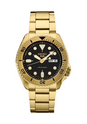 Available exclusively in the U.S., this luxe watch from Seiko features a black dial with luminous hands and markers. Plus, it is water-resistant up to 330 feet! | Seiko Men’s 5 Sports US Special Edition Gold Series Automatic Movement YT Case and Bracelet Watch
