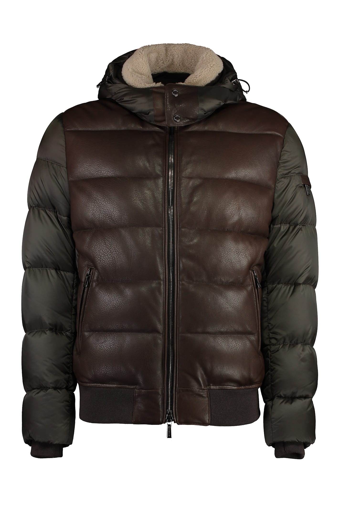 Water-resistant fabricleather frontal panelribbed knit hempadding: 100% goose down100% leather, 100% polyamideComposition: 100% % Leather, 100% % Polyamide