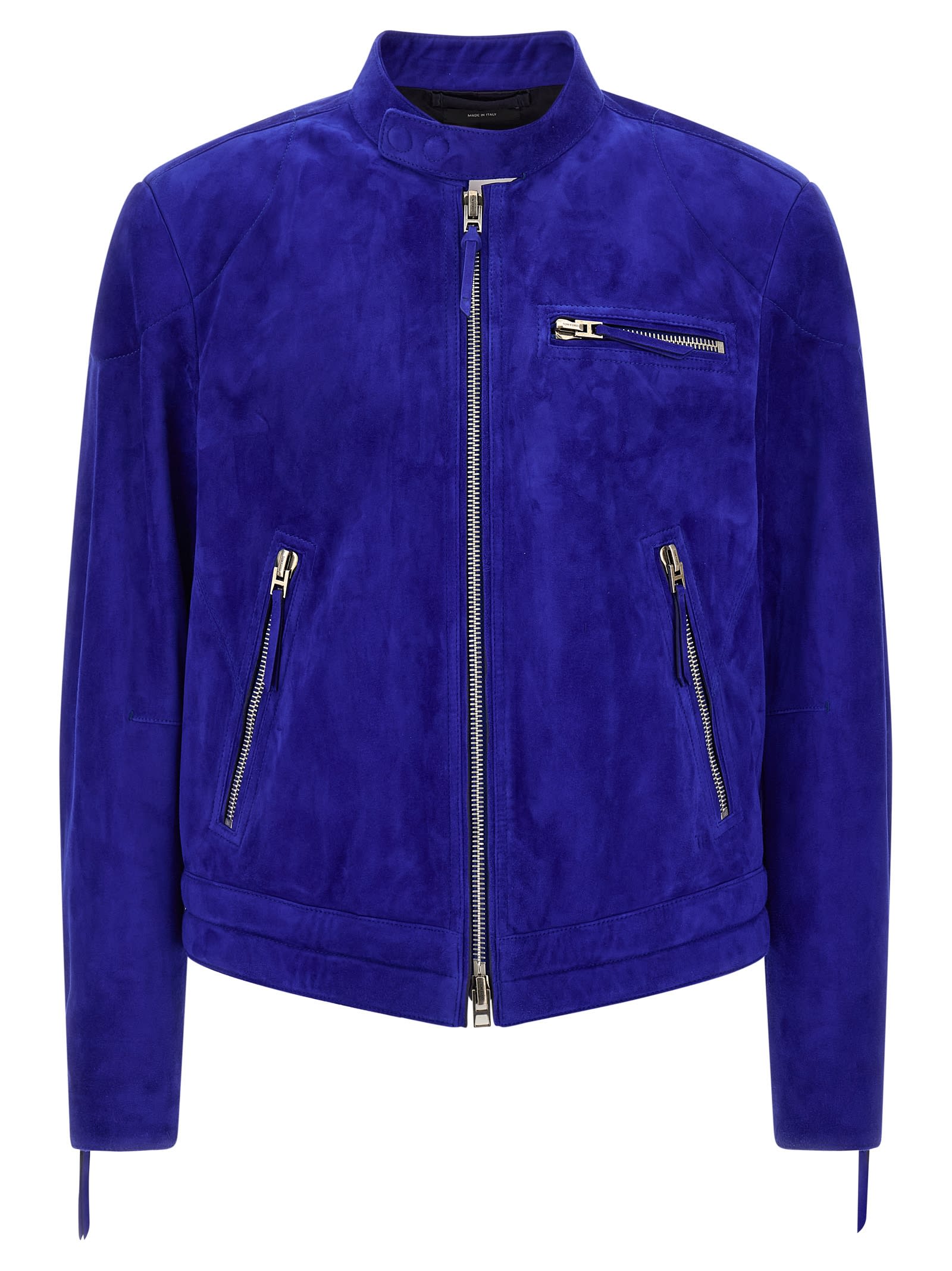 Suede cashmere jacket with slightly padded details, biker style, high neck with snap button closure, front zip closure, pockets, long sleeves with zip on the cuffs, lining. Composition: 100% calfskin leather (Bos Taurus)